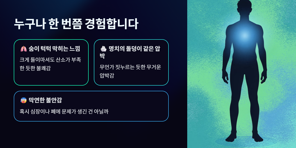 숨을 크게 들이마셔도 산소가 턱없이 부족한 느낌, 혹은 명치끝에 커다란 돌덩이가 얹혀 있는 듯한 무거운 압박감. 현대인이라면 누구나 한 번쯤 일상생활 중 예고 없이 찾아오는 '가슴이 답답한 증세'를 경험해 보았을 것입니다. 단순한 피로감이나 소화불량으로 치부하고 넘기기에는 호흡이 불편해지는 불쾌감이 크고, '혹시 심장이나 폐에 심각한 문제가 생긴 것은 아닐까' 하는 두려움마저 엄습합니다.