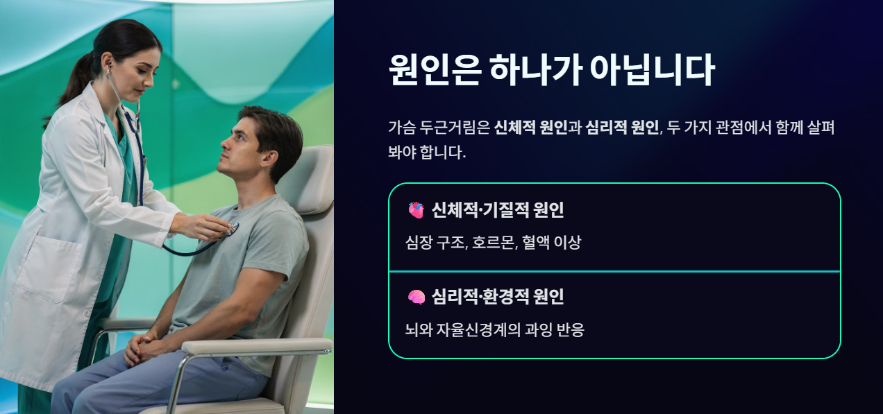가슴이 두근거리는 증상은 한가지 원인으로만 발생하지 않습니다. 정확하고 안전한 대처를 위해서는 이 증상을 신체적 요인(기질적 질환)과 심리적 요인(정신적 스트레스)이라는 두 가지 상반된 관점에서 입체적으로 들여다보아야 합니다.