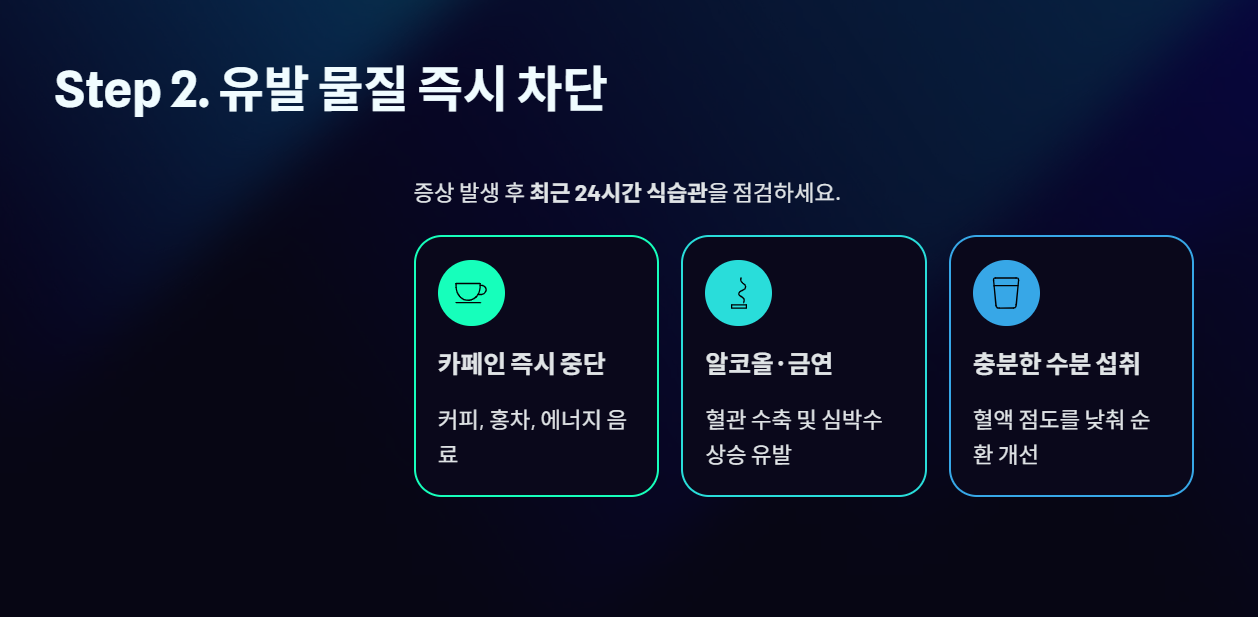 - 카페인 중단: 커피, 홍차, 에너지 음료의 섭취를 즉시 중단하세요.