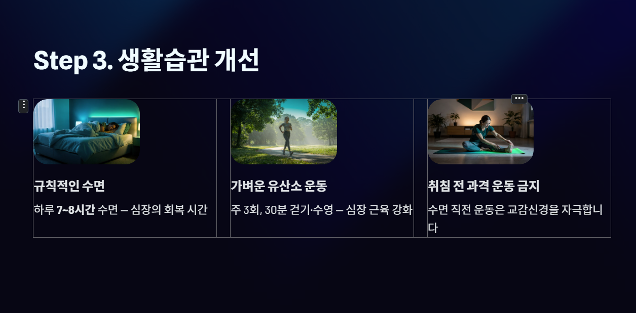 근본적인 자율신경계 밸런스 회복을 위해서는 생활습관 교정이 필수입니다. 하루 7~8시간의 규칙적이고 질 높은 수면은 심장이 충분히 휴식하고 회복할 수 있는 중요한 시간입니다. 또한 주 3회, 하루 30분 이상의 가벼운 걷기나 수영 같은 유산소 운동은 심장 근육을 강화하고 체내 스트레스 호르몬을 낮추는 데 도움이 됩니다. 단, 수면 직전의 과격한 운동은 교감신경을 자극할 수 있으므로 피하는 것이 좋습니다.