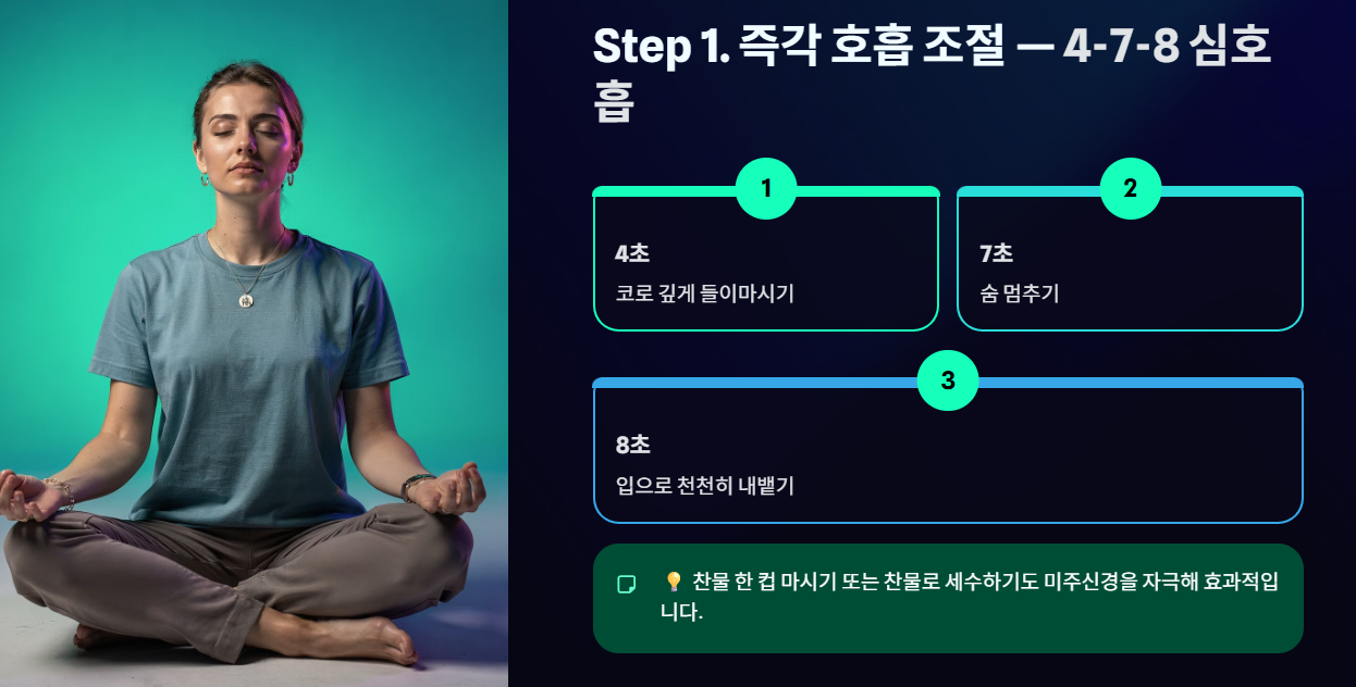 이 과정은 과항진된 교감신경을 억제하고 부교감신경(미주신경)을 자극하여 심장 박동을 즉각적으로 늦추는 데 탁월한 효과가 있습니다. 찬물을 한 컵 천천히 마시거나, 찬물로 세수를 하는 것도 미주신경을 자극하는 좋은 방법입니다.
