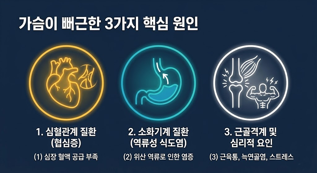 가슴이 뻐근한 증상의 핵심 원인은 크게 3가지로 나누어 볼 수 있습니다. 첫 번째는 심혈관계 질환, 두 번째는 소화기계 질환, 세 번째는 근골격계 질환 및 심리적 요인입니다.