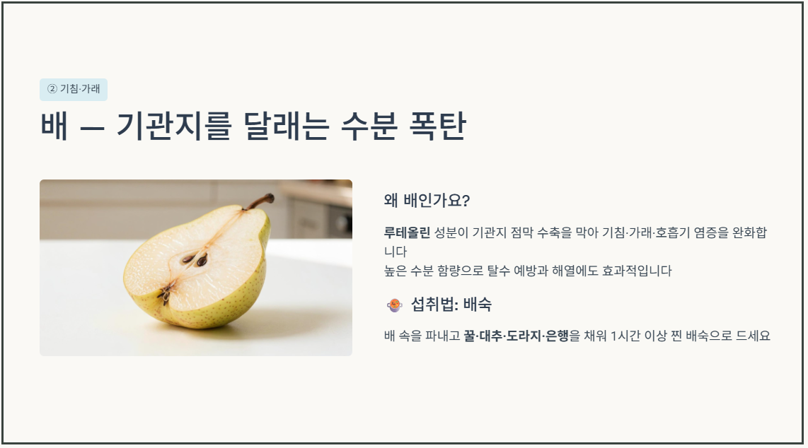 배에 풍부하게 함유된 루테올린(Luteolin) 성분은 기관지 점막의 수축을 막아줍니다. 이로 인해 기침, 가래, 천식 등 각종 호흡기 질환의 증상을 완화하는 데 매우 효과적입니다. 또한 수분 함량이 높아 감기로 인한 탈수를 예방하고 열을 식혀줍니다.