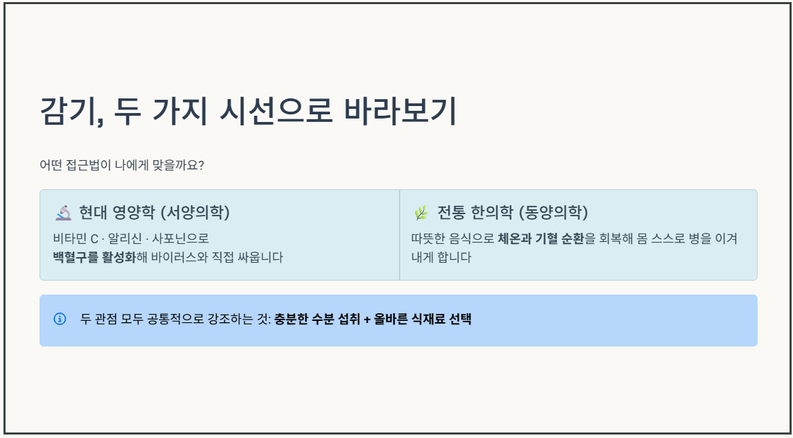 - 전통 한의학적 관점 (동양의학): 한의학에서는 감기를 외부의 차가운 기운(한기)이 면역력이 떨어진 틈을 타 몸에 침투한 것으로 해석합니다. 따라서 따뜻한 성질을 지닌 음식을 섭취해 체온을 높이고, 기혈의 순환을 원활하게 만들어 몸 스스로 병사를 몰아내는 '자연 치유력과 균형 회복'에 초점을 맞춥니다.