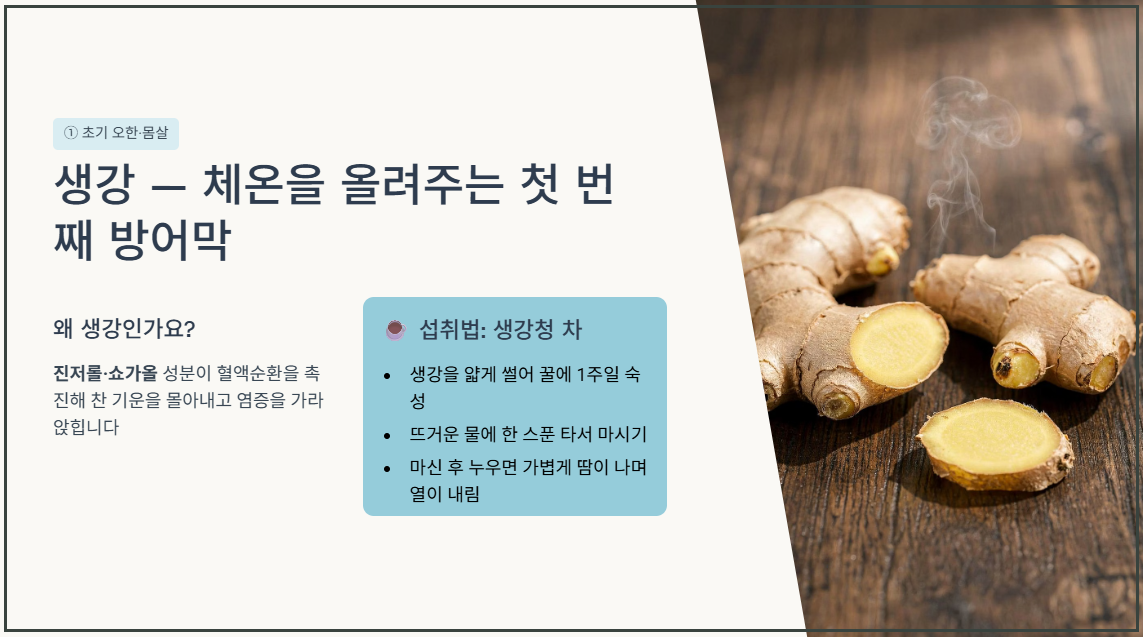 - 섭취 방법: 깨끗이 씻은 생강을 얇게 편으로 썰어 꿀에 일주일 정도 재워둡니다. 초기 오한이 느껴지거나 몸이 으슬으슬할 때, 이 생강청을 뜨거운 물에 크게 한 스푼 타서 '생강차'로 마십니다. 따뜻하게 한 잔 마시고 누우면 가볍게 땀이 나면서 열이 떨어지는 효과를 볼 수 있습니다.