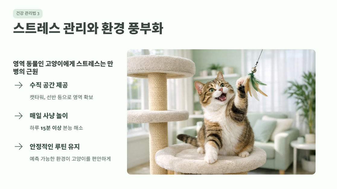 영역 동물인 고양이에게 스트레스는 만병의 근원입니다. 수직 공간(캣타워)을 충분히 제공하고, 매일 15분 이상의 사냥 놀이를 통해 본능을 해소해주어 정신적, 신체적 활력을 유지해 주는 것이 중요합니다.