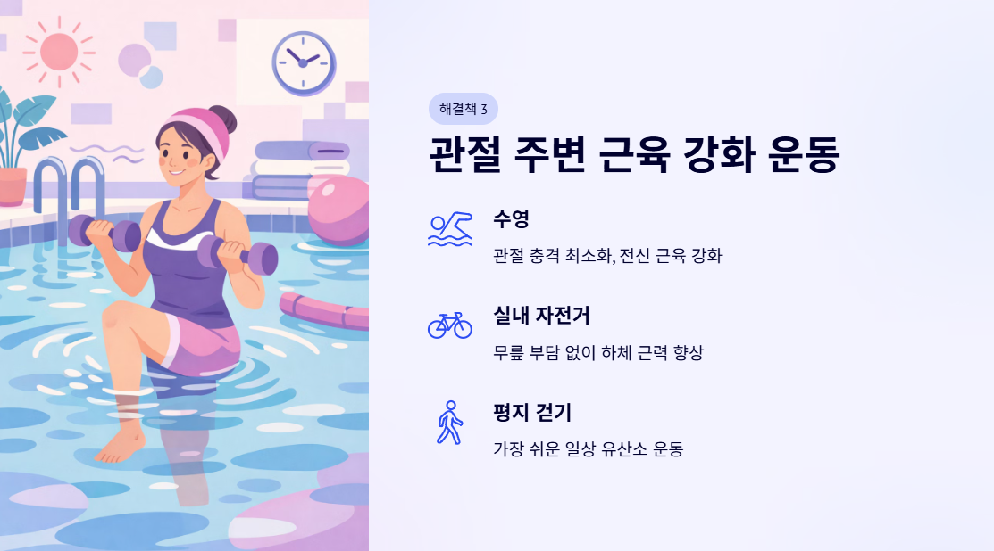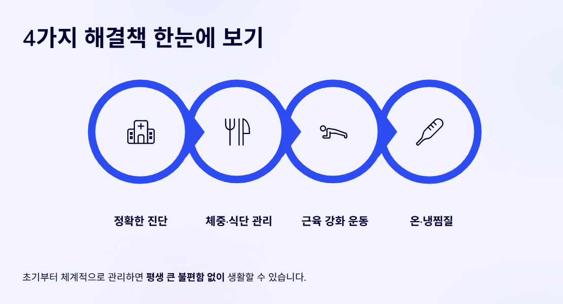 - 해결 방법: 정확한 병원 진단 → 적정 체중 유지 → 관절 주변 근력 강화 → 온/냉찜질을 통한 일상 케어