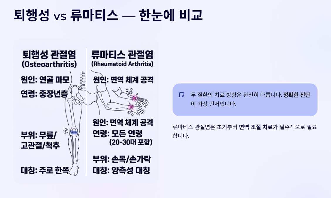 - 주요 원인: 연골 마모에 의한 퇴행성 관절염 vs 면역 이상에 의한 류마티스 관절염
