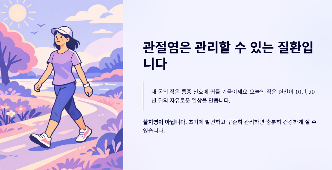 내 몸이 보내는 작은 통증의 시그널에 귀를 기울이세요. 관절염은 불치병이 아니라, 초기에 발견해 잘 관리하면 평생 큰 불편함 없이 지낼 수 있는 '관리형 질환'입니다. 오늘 알아본 대처법을 지금 바로 실천하여 10년, 20년 뒤에도 자유롭고 활기찬 일상을 누리시기를 바랍니다.
