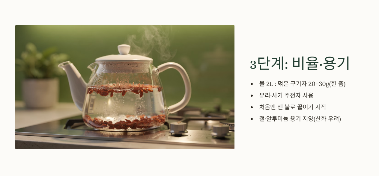 물 2리터 기준으로 덖은 구기자 20g~30g(약 한 줌)이 황금 비율입니다. 유리나 사기 주전자에 물과 구기자를 함께 넣고 처음에는 센 불에서 끓이기 시작합니다. 철이나 알루미늄 재질의 용기는 구기자의 항산화 성분과 반응해 산화될 수 있으므로 피하는 것이 좋습니다.