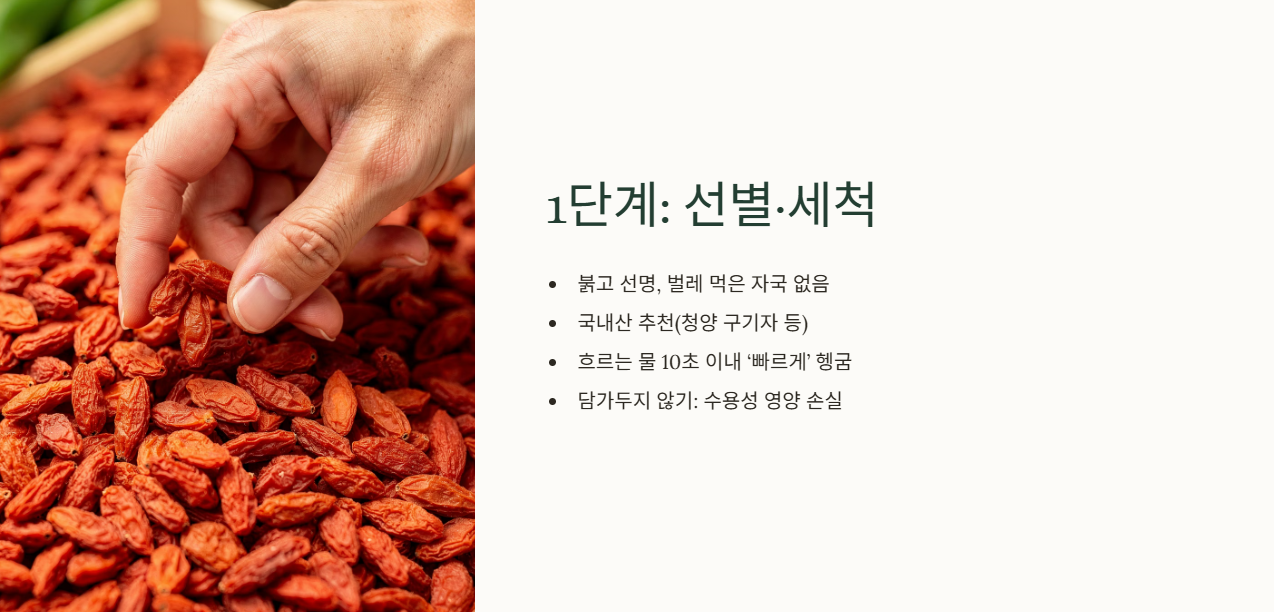 색이 붉고 선명하며, 벌레 먹은 자국이 없는 국내산(특히 청양 구기자 등이 유명)을 선택하는 것이 좋습니다. 건조된 구기자 표면에는 먼지가 묻어있을 수 있습니다. 흐르는 물에 가볍게 비벼서 10초 이내로 빠르게 씻어냅니다. 물에 오래 담가두면 수용성 영양분이 모두 빠져나가니 주의해야 합니다.
