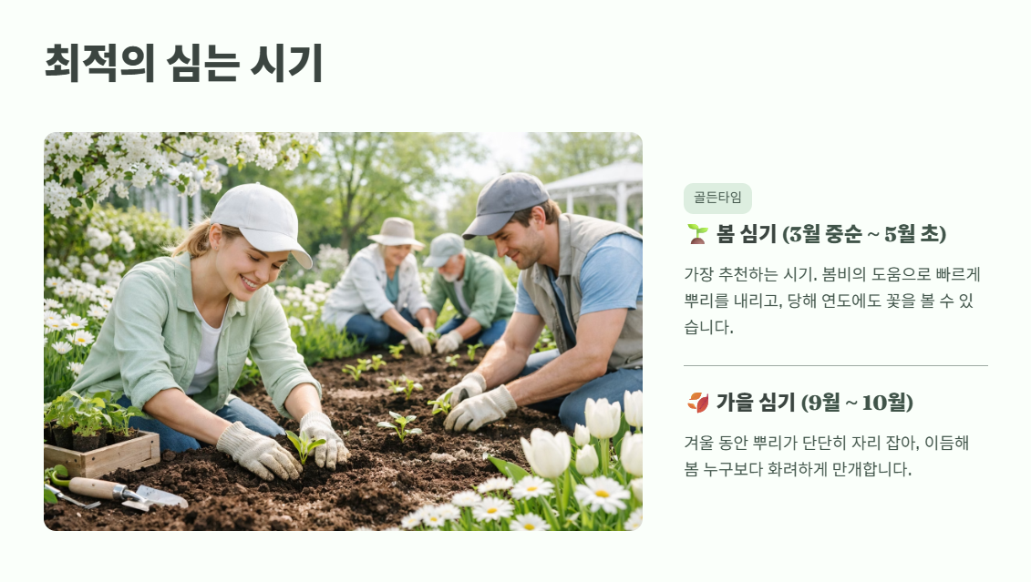 - 심는 시기: 3~5월(봄) 또는 9~10월(가을)이 뿌리 활착에 최적기입니다.