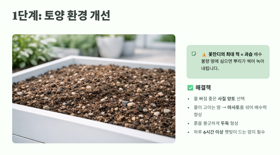해결책: 물 빠짐이 좋은 사질 양토가 최고입니다. 땅에 물이 잘 고인다면 흙을 봉긋하게 돋우어 두둑을 만들어 주거나, 마사토(굵은 모래)를 섞어 배수력을 높여야 합니다. 햇빛이 하루 6시간 이상 드는 양지를 선택하는 것도 필수입니다.