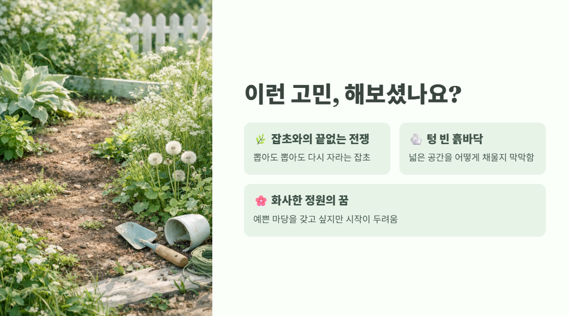 봄맞이 정원 단장을 꿈꾸지만, 끊임없이 자라나는 잡초를 뽑을 생각에 벌써부터 한숨이 나오시나요? 혹은 넓은 흙바닥을 어떻게 채워야 할지 막막해 방치하고 계시지는 않나요?