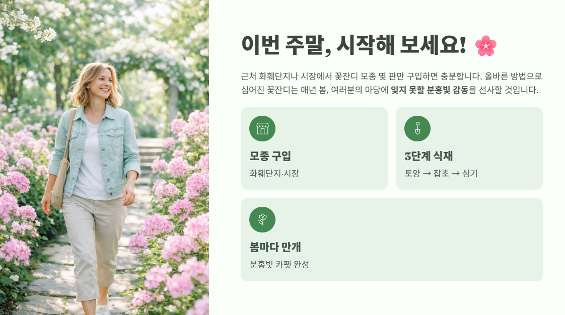 올바른 방법으로 심어진 꽃잔디는 매년 봄, 여러분의 마당에 잊지 못할 분홍빛 감동을 선사할 것입니다. 지금 바로 정원의 빈 공간을 확인하고 어떤 식물을 심을지 계획해보세요!