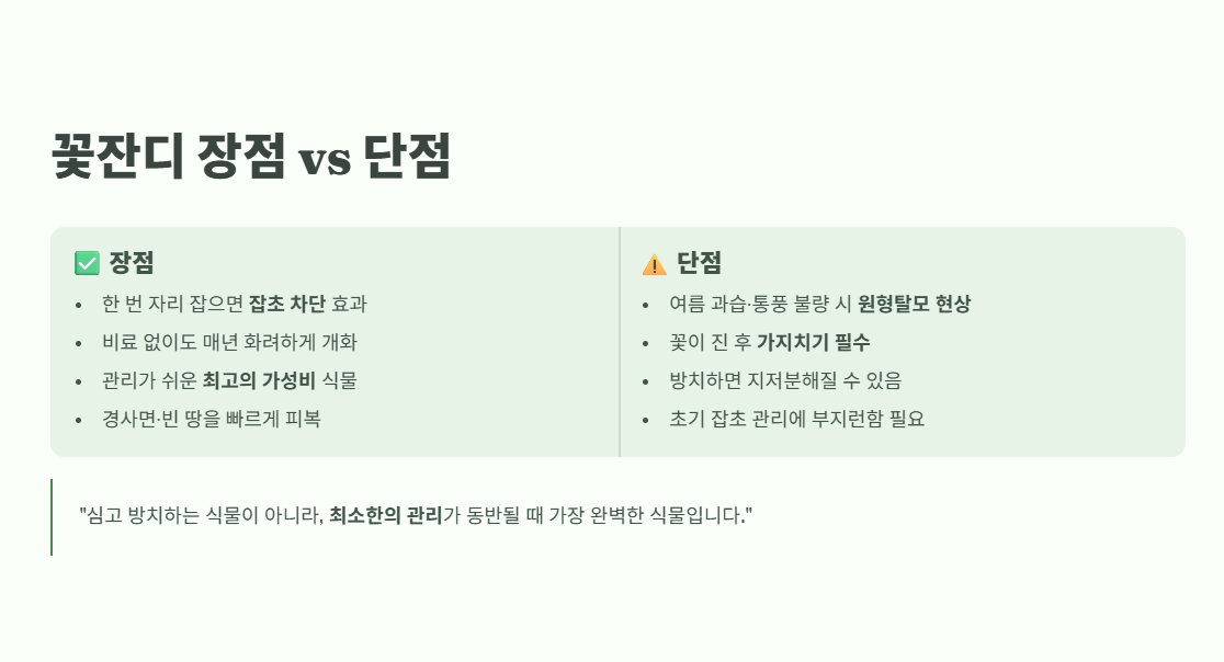 "꽃잔디는 최고의 지피식물(땅을 덮는 식물)입니다. 한 번 제대로 자리 잡으면 두꺼운 매트를 형성해 잡초가 자랄 틈을 주지 않으며, 매년 봄마다 비료를 챙겨주지 않아도 화려한 꽃을 피워내는 완벽한 가성비 식물입니다." - 단점: 꾸준한 관리가 필요한 꽃잔디