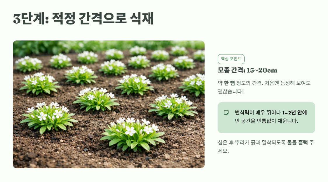 해결책: 모종과 모종 사이를 15~20cm (약 한 뼘) 정도 간격을 두고 심으세요. 처음에는 듬성듬성 비어 보여 아쉬울 수 있지만, 번식력이 매우 뛰어나 1~2년 안에 빈 공간을 빈틈없이 꽉 채우게 됩니다. 심은 후에는 뿌리가 흙과 밀착되도록 물을 흠뻑 줍니다.