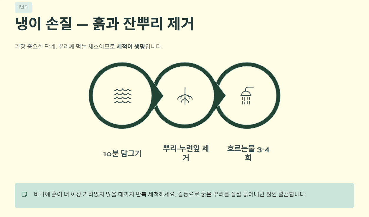 - 헹구기: 흐르는 물에 3~4번 충분히 흔들어 씻어냅니다. 바닥에 흙이 더 이상 가라앉지 않을 때까지 세척한 후, 먹기 좋은 크기로 썰어줍니다.