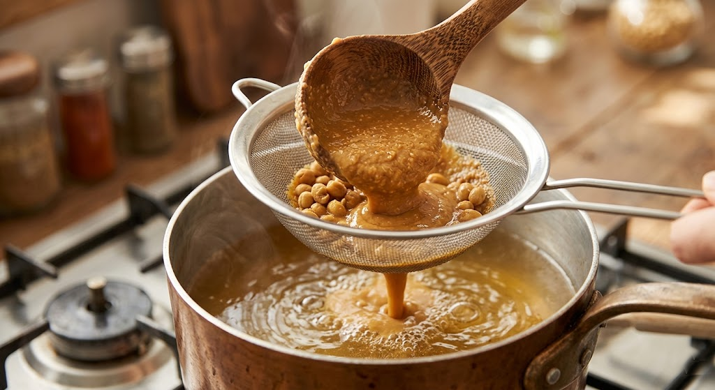 - 완성된 육수에 된장 2~3스푼을 체에 밭쳐 곱게 풀어줍니다. (집된장과 시판 된장을 1:1 비율로 섞으면 맛이 더욱 깊어집니다.)