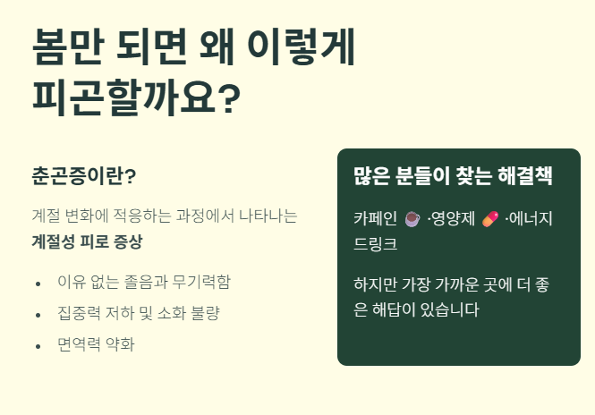 따뜻한 봄이 되면 이유 없이 피곤하고 졸음이 쏟아지는 ‘춘곤증’을 느끼는 분들이 많습니다.