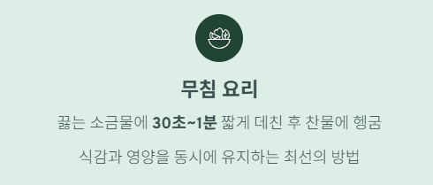 끓는 물에 소금을 약간 넣고 30초~1분 이내로 짧게 데치는 것이 좋습니다. 이후 찬물에 헹궈 물기를 제거한 뒤 양념하면 식감과 영양을 비교적 잘 유지할 수 있습니다. - 국물 요리