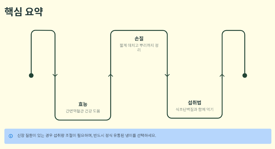 또한 간의 해독 작용을 돕는 데 긍정적인 영향을 줄 수 있어 피로가 쌓이기 쉬운 현대인에게 도움이 되는 식재료로 알려져 있습니다.