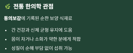 전통적으로 간 건강과 전반적인 신체 균형 유지에 도움을 줄 수 있는 식재료로 알려져 있으며, 평소 몸이 차거나 소화 기능이 약한 사람에게 비교적 부담 없이 섭취할 수 있는 식품으로 여겨집니다.
