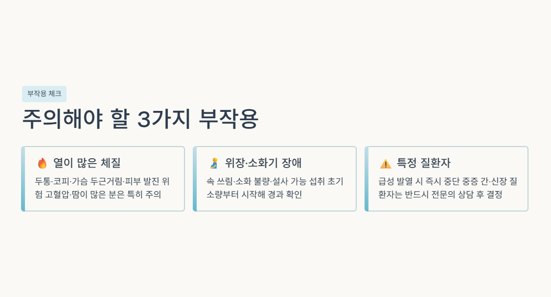 아무리 뛰어난 명약이라도 내 체질에 맞지 않으면 독이 될 수 있습니다. 피로를 풀려다 오히려 병을 얻지 않으려면 다음 부작용을 반드시 점검해야 합니다.