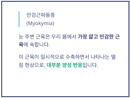 이 근육이 일시적으로 수축하면서 떨리는 증상을 의학적으로는 ‘안검근파동증(Myokymia)’이라고 합니다.