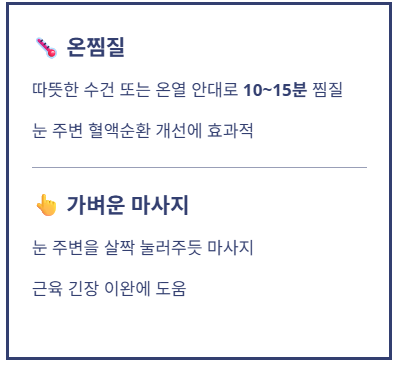 또한 눈 주변을 가볍게 눌러주는 마사지도 근육 이완에 도움이 됩니다.