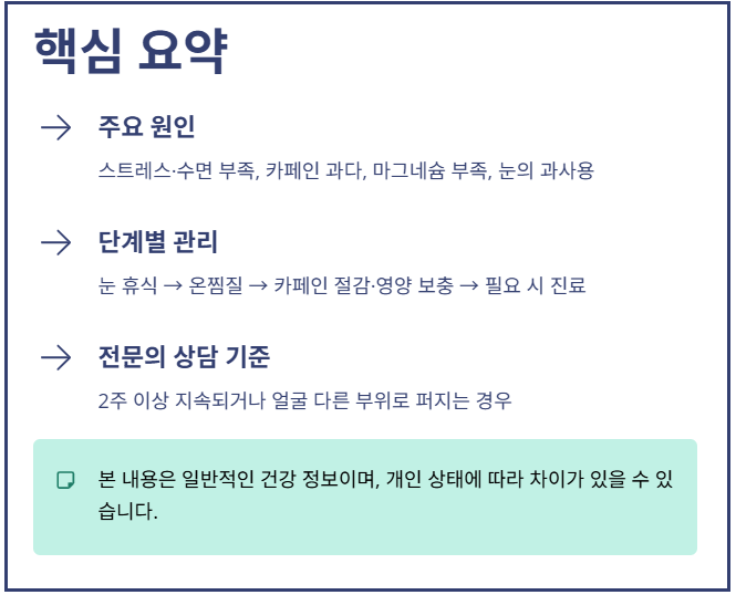 스트레스와 수면 부족, 과도한 카페인 섭취, 마그네슘 부족, 눈의 과도한 사용 등이 눈 주변 근육 긴장에 영향을 줄 수 있습니다. - 단계별 해결책