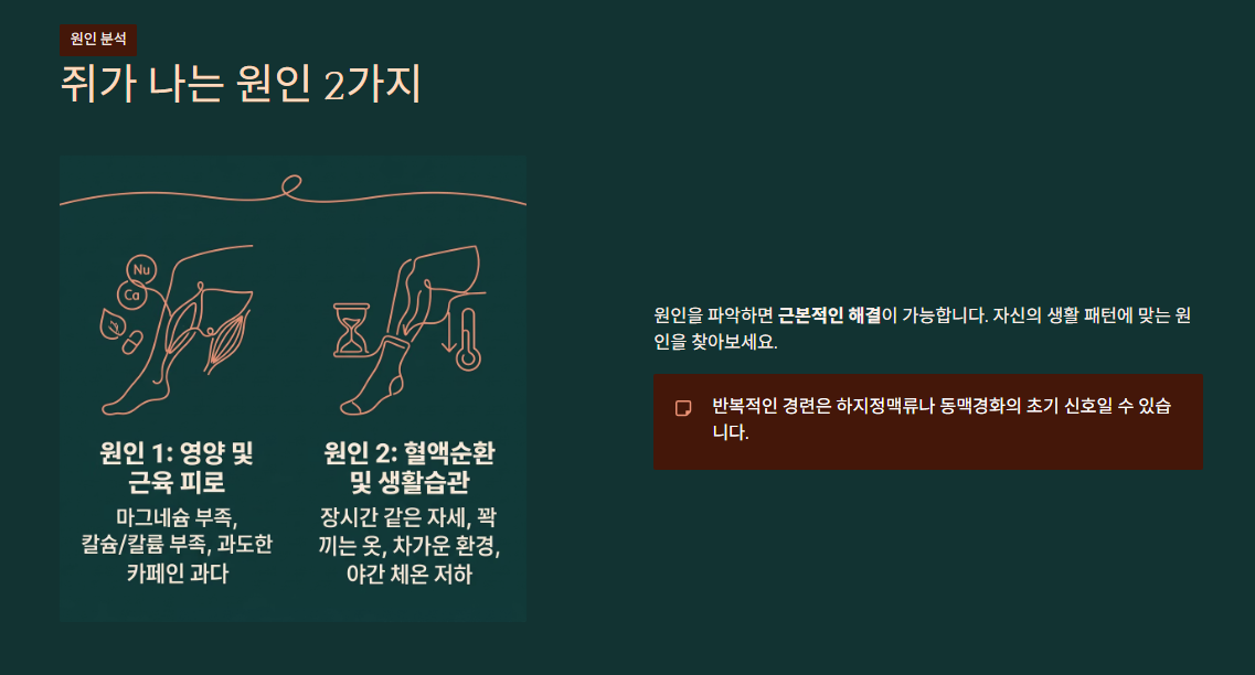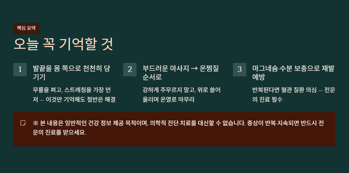 - 근본 예방: 평소 땀을 많이 흘린다면 이온 음료와 마그네슘을 섭취하고, 서 있거나 앉아 있는 시간이 길다면 취침 전 다리 스트레칭과 반신욕을 통해 혈액순환을 촉진해야 합니다.
