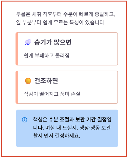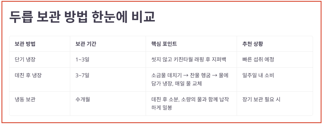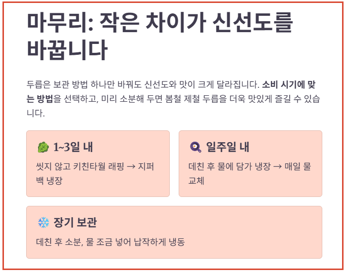 헷갈리기 쉬운 두릅 보관 방법을 소비 기간에 따라 3단계로 나누어 정리했습니다. 보관 기간에 맞는 방법만 선택해도 두릅 신선도를 훨씬 오래 유지할 수 있습니다.