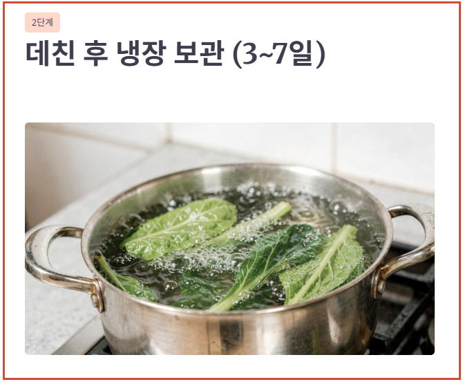 두릅 보관 방법 중 중기 보관에 해당하는 방법으로, 바로 먹지 못할 경우 데친 후 냉장 보관하는 것이 신선도를 유지하는 데 효과적입니다.