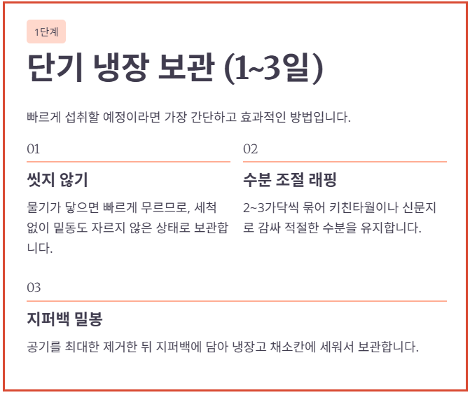 - 지퍼백 밀봉 보관: 공기를 최대한 제거한 뒤 지퍼백에 담아 냉장고 채소칸에 보관합니다.
