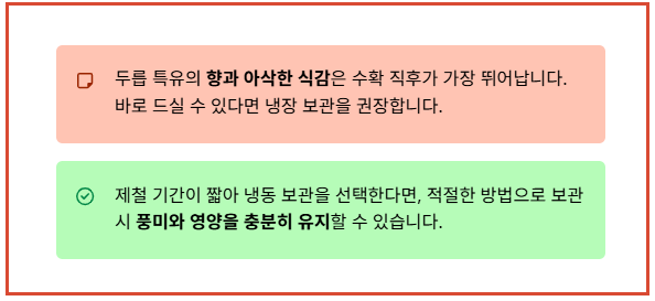 두릅 보관 방법이 어렵게 느껴졌다면, 아래 내용만 기억해도 충분합니다. 소비 시기에 따라 보관 방법을 선택하는 것이 가장 중요합니다.