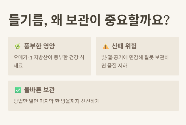 하지만 들기름은 보관 방법에 따라 맛과 품질이 크게 달라질 수 있습니다. 특히 상온에 오래 두면 산패가 진행되어 풍미가 떨어지고, 건강에도 좋지 않을 수 있습니다.