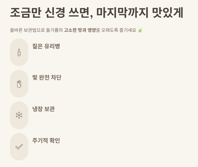 들기름의 산패를 줄이고 신선도를 오래 유지하기 위한 보관 방법을 4단계로 정리했습니다. 아래 방법을 참고하시면 들기름을 보다 안정적으로 보관할 수 있습니다.