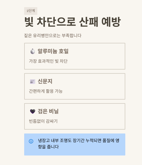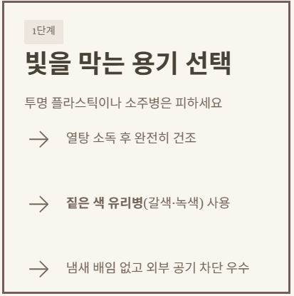 - 용기와 포장: 짙은 색 유리병에 담은 뒤 알루미늄 호일이나 신문지로 감싸 빛을 최대한 차단합니다.
