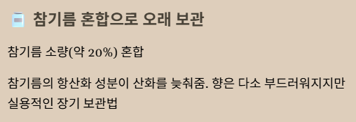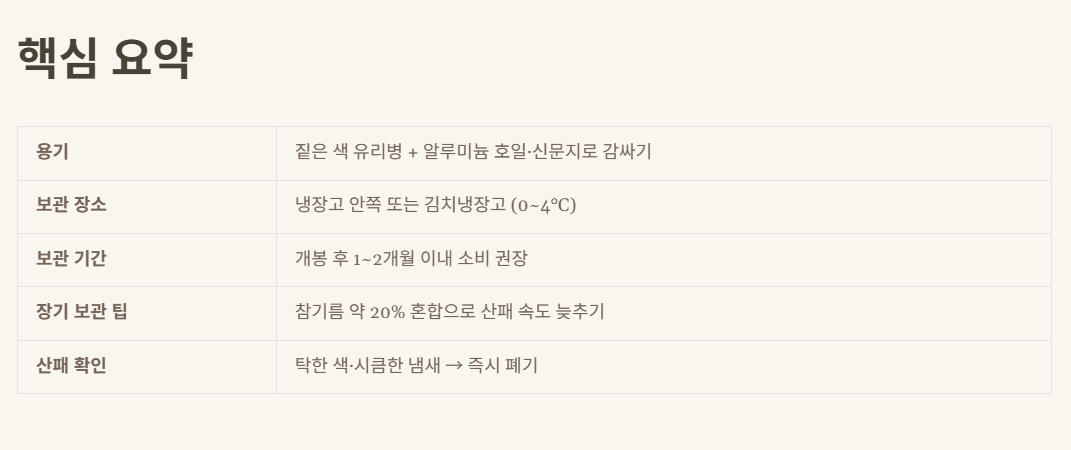 - 보관 기간을 늘리는 방법: 개봉 후 1~2개월 이내 섭취가 가장 좋지만, 장기 보관이 필요한 경우 참기름을 소량(약 20%) 섞어 산패 속도를 늦추는 방법도 있습니다.