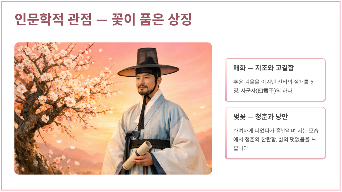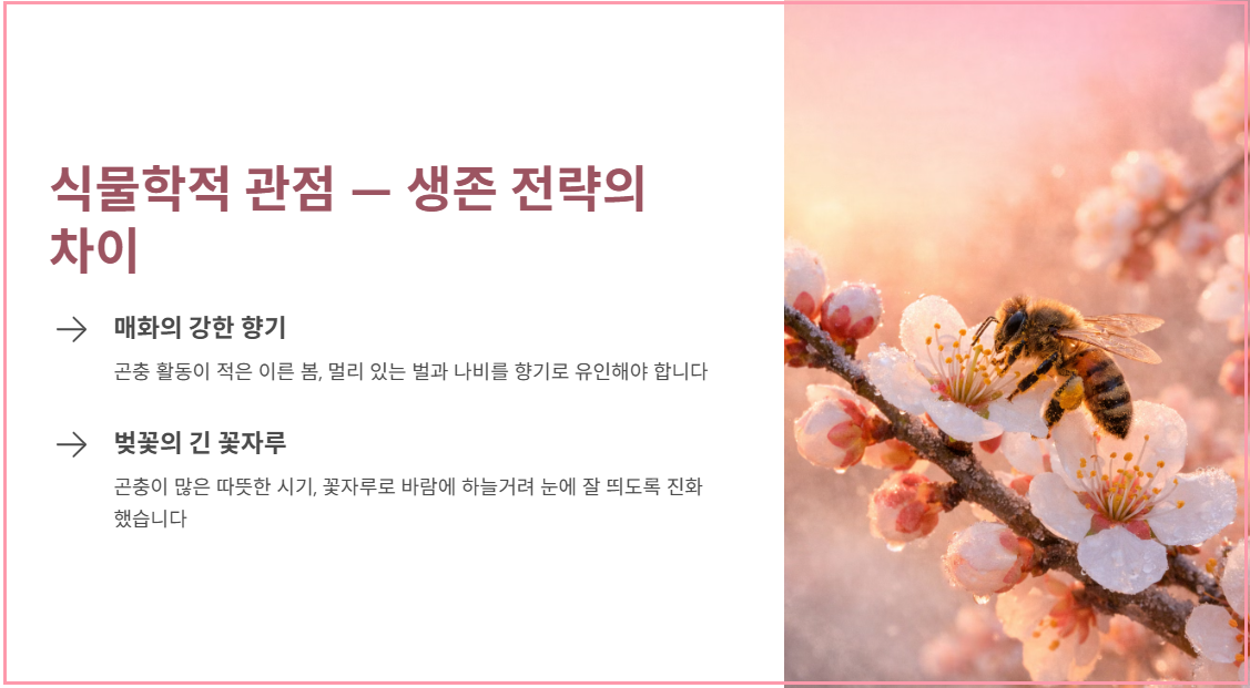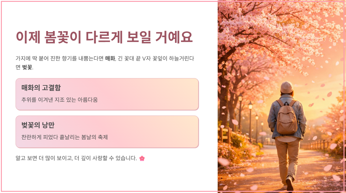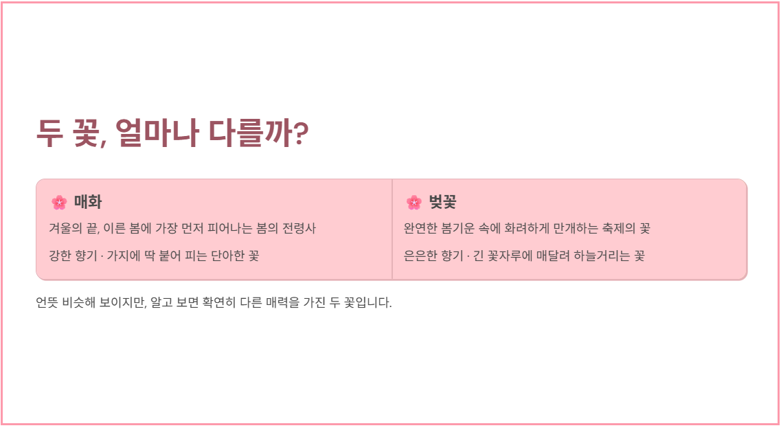 - 피는 시기: 매화(2월 말~3월 초, 이름) vs 벚꽃(3월 말~4월 초, 늦음)