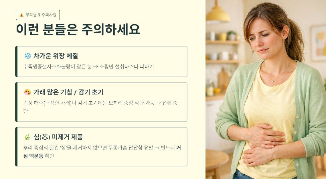 - 맥문동은 기본적으로 '차가운 성질'을 가지고 있습니다. 평소 수족냉증이 있거나 위장이 차서 설사나 소화불량이 잦은 분들은 섭취를 피하거나 소량만 드셔야 합니다.