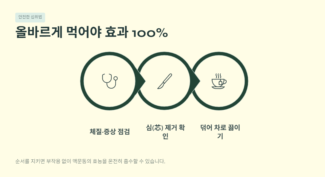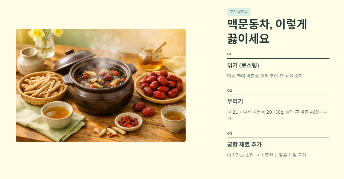 - 가장 추천하는 섭취 방법은 '맥문동차'입니다. 찬 성질을 완화하고 구수한 맛을 끌어올리기 위해, 마른 프라이팬에 맥문동을 약불로 살짝 덖어줍니다 (로스팅 과정).
