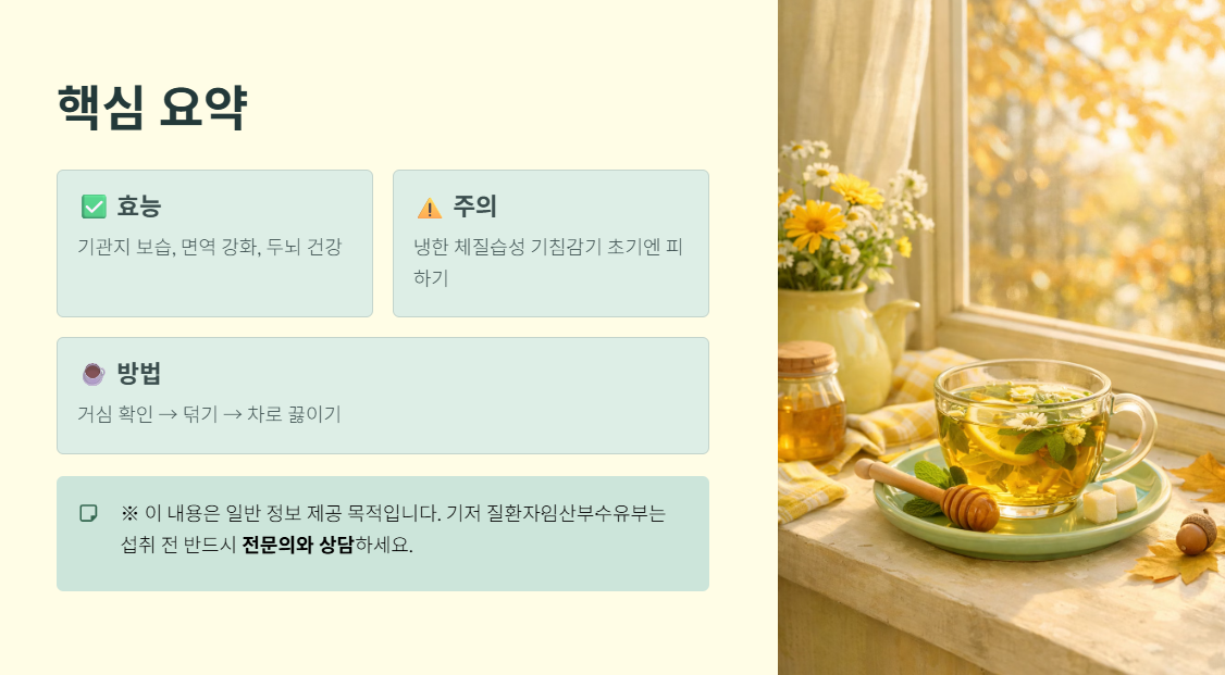 - 건조한 마른기침에는 특효약이지만, 끈적하고 맑은 가래가 많이 끓는 기침(습성 해수)이나 감기 초기에는 오히려 증상을 악화시킬 수 있으므로 섭취를 중단해야 합니다.