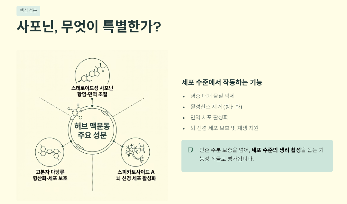 - 전통 한의학적 관점: 동의보감에서는 맥문동을 '음(陰)을 보충하고 폐를 편안하게 하며, 심장의 열을 내려주는 약재'로 기록하고 있습니다. 즉, 체내의 진액(수분)을 생성하여 몸속 깊은 곳의 건조함을 해소하고, 위장의 열을 식혀 갈증을 멎게 하는 '자음윤폐(滋陰潤肺)'의 핵심 약재로 봅니다.