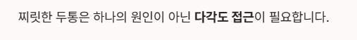 머리가 찌릿하게 아플 때는 바로 진통제에 의존하기보다는, 긴장된 신경과 근육을 완화하는 단계적인 접근이 도움이 될 수 있습니다.