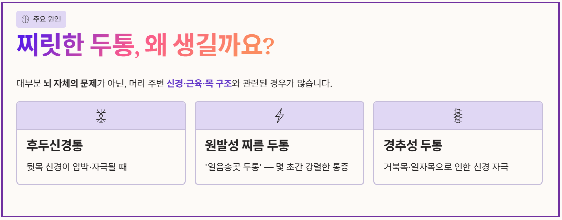 찌르는 듯한 두통은 대부분 뇌 자체의 문제라기보다는 머리 주변 신경이나 근육, 목구조와 관련된 경우가 많습니다.