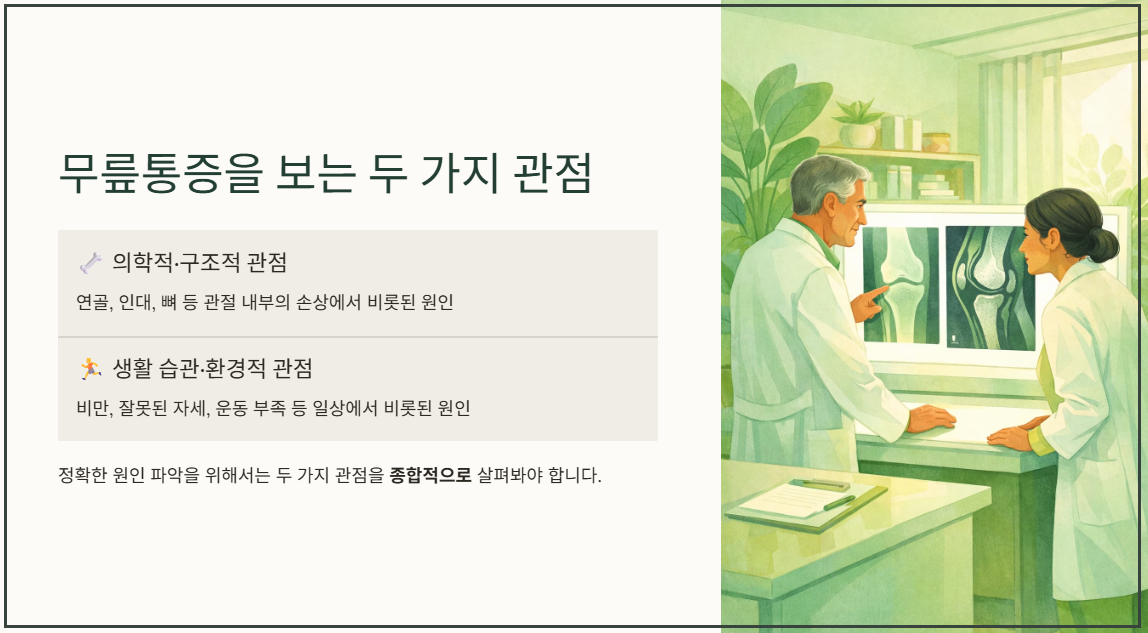 무릎통증의 원인을 파악할 때는 단순히 뼈나 연골의 문제만으로 보기보다는, 더 넓은 관점에서 접근할 필요가 있습니다. 의학적(구조적) 관점과 생활 습관(환경적) 관점 두 가지 측면에서 종합적으로 접근해야 정확한 원인을 찾을 수 있습니다.