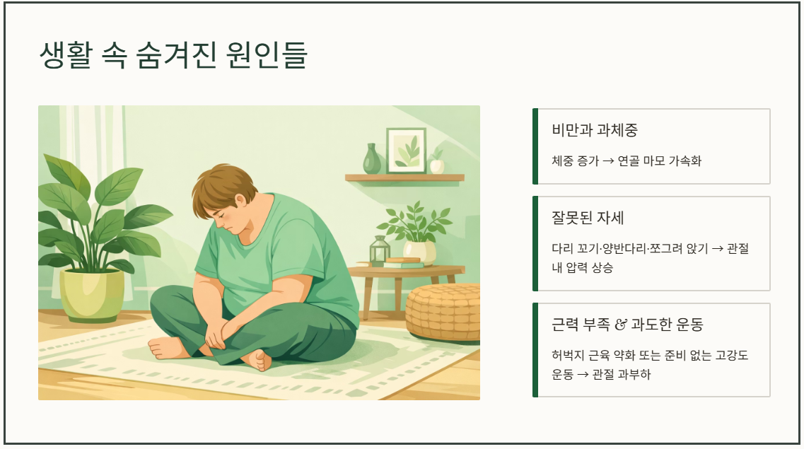- 잘못된 자세: 다리를 꼬고 앉거나 양반다리를 하는 습관, 쪼그려 앉아 집안일을 하는 자세는 무릎 관절 내부의 압력을 비정상적으로 높여 통증을 유발합니다.