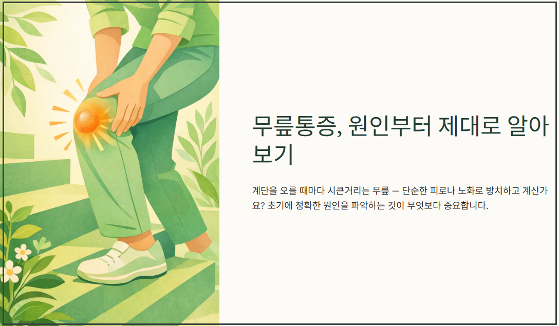 ※ 이 글은 일반적인 건강 정보 제공을 목적으로 작성되었으며, 의학적 진단이나 치료를 대신할 수 없습니다. 무릎통증의 정확한 원인 파악과 안전을 위해서는 반드시 전문의의 진료를 받으시기 바랍니다.